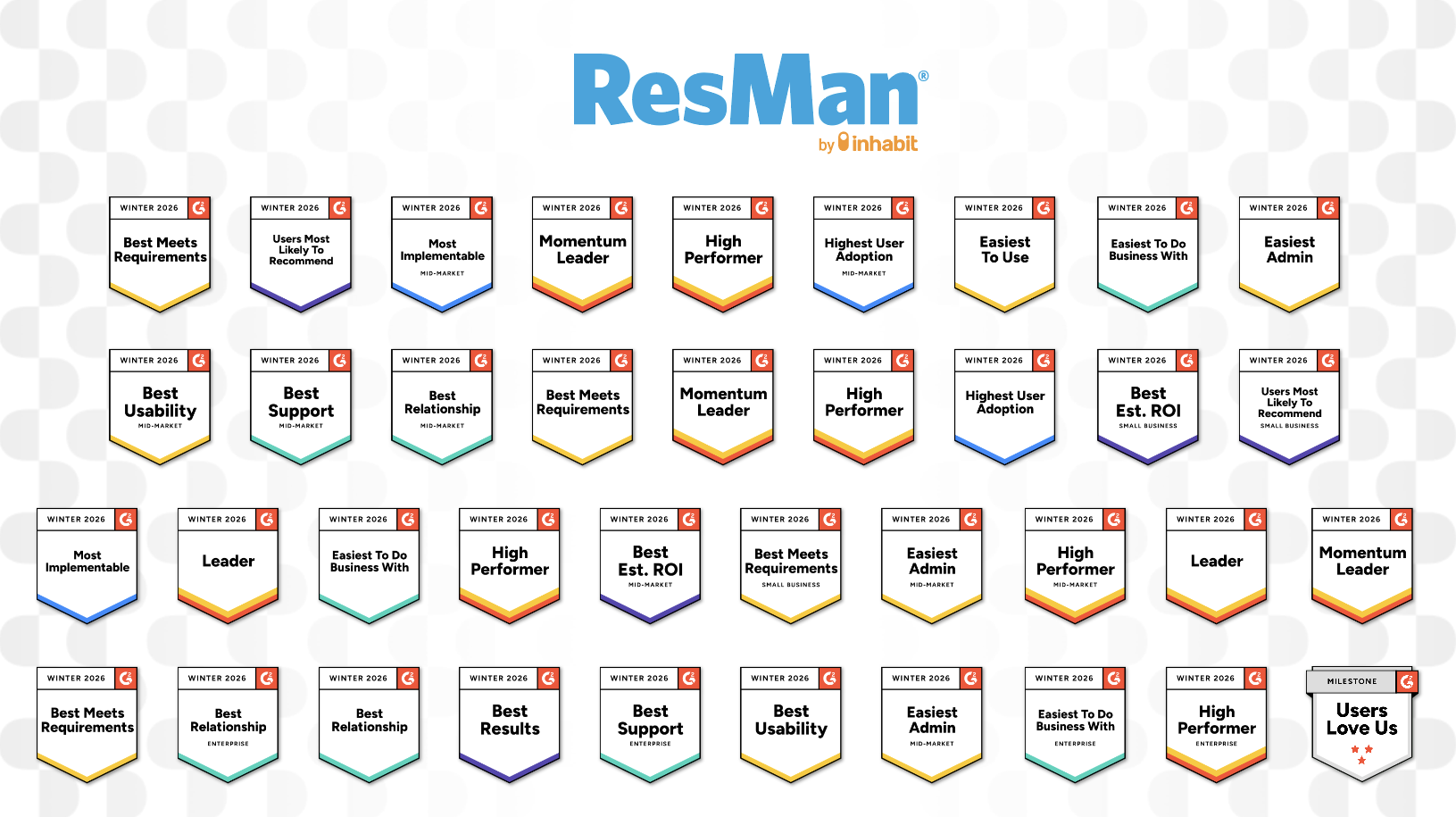 ResMan earned 61 badges in G2’s Winter 2026 Reports across Property Management, Lease Administration, Real Estate Marketing, CRM, and Community Association Management — including 37 unique awards. Our most ever!
